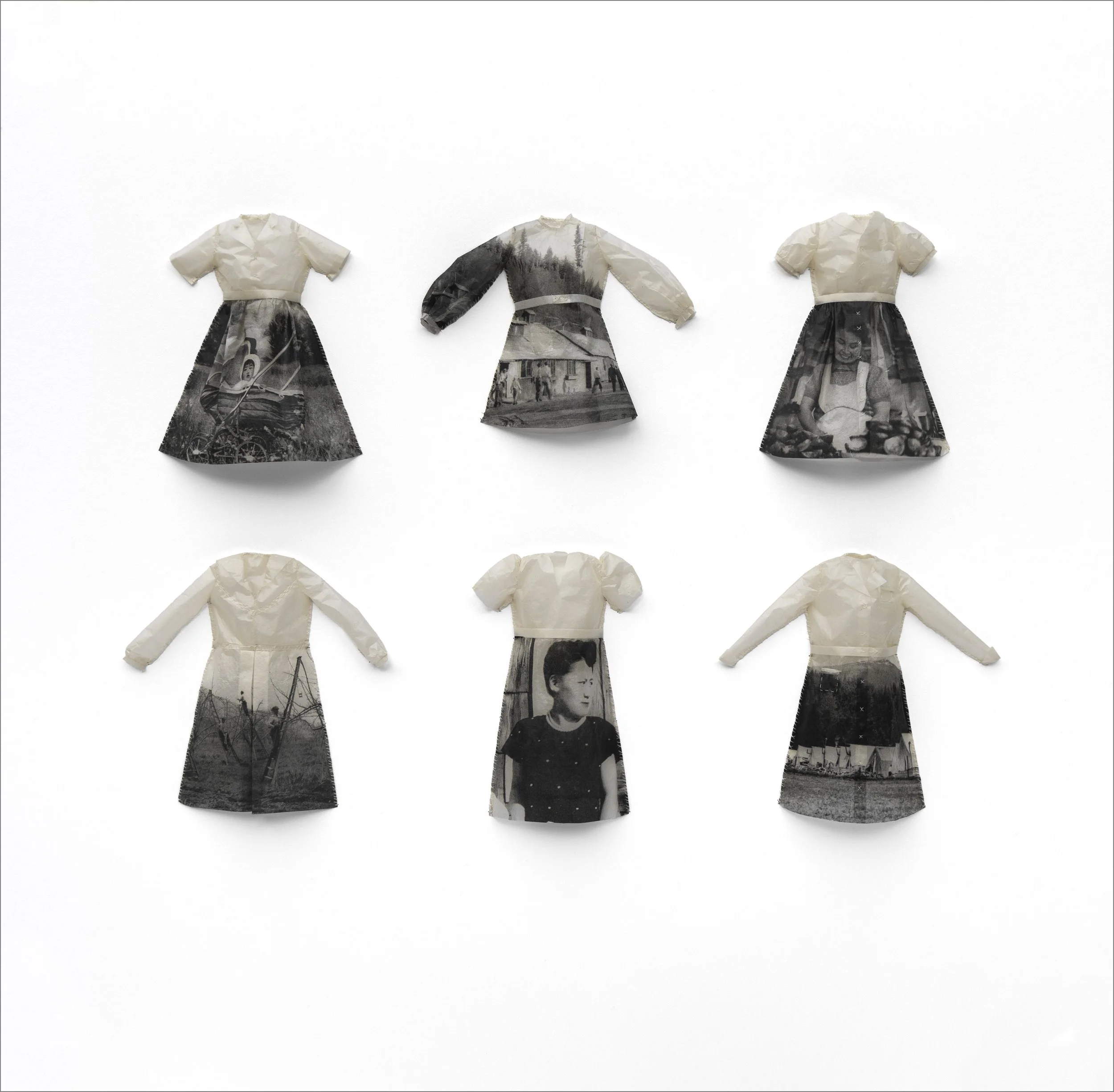This series of work stems from my grandmother’s/ my baachan’s story, her journey, which in turn has become a part of my own. Four years after my grandmother’s death I found a box labeled ‘Baachan’s sewing patterns’ in the basement of my mother’s home. Inside lay over two hundred miniature paper articles of clothing; dresses, jackets, children’s jumpers and shirts, all of which my grandmother made as mock ups before beginning the actual clothing. The box also contained five books of detailed clothing patterns that she began working on during the summer of 1941 in a drafting class. Within the pages of these patterns are other pieces of paper full of Japanese names and measurements. The date on these pages is 1943, and all of the people mentioned would have been living with my grandmother in Slocan, the camp where my grandmother, along with hundreds of other Japanese Canadians, was interned during the Second World War.